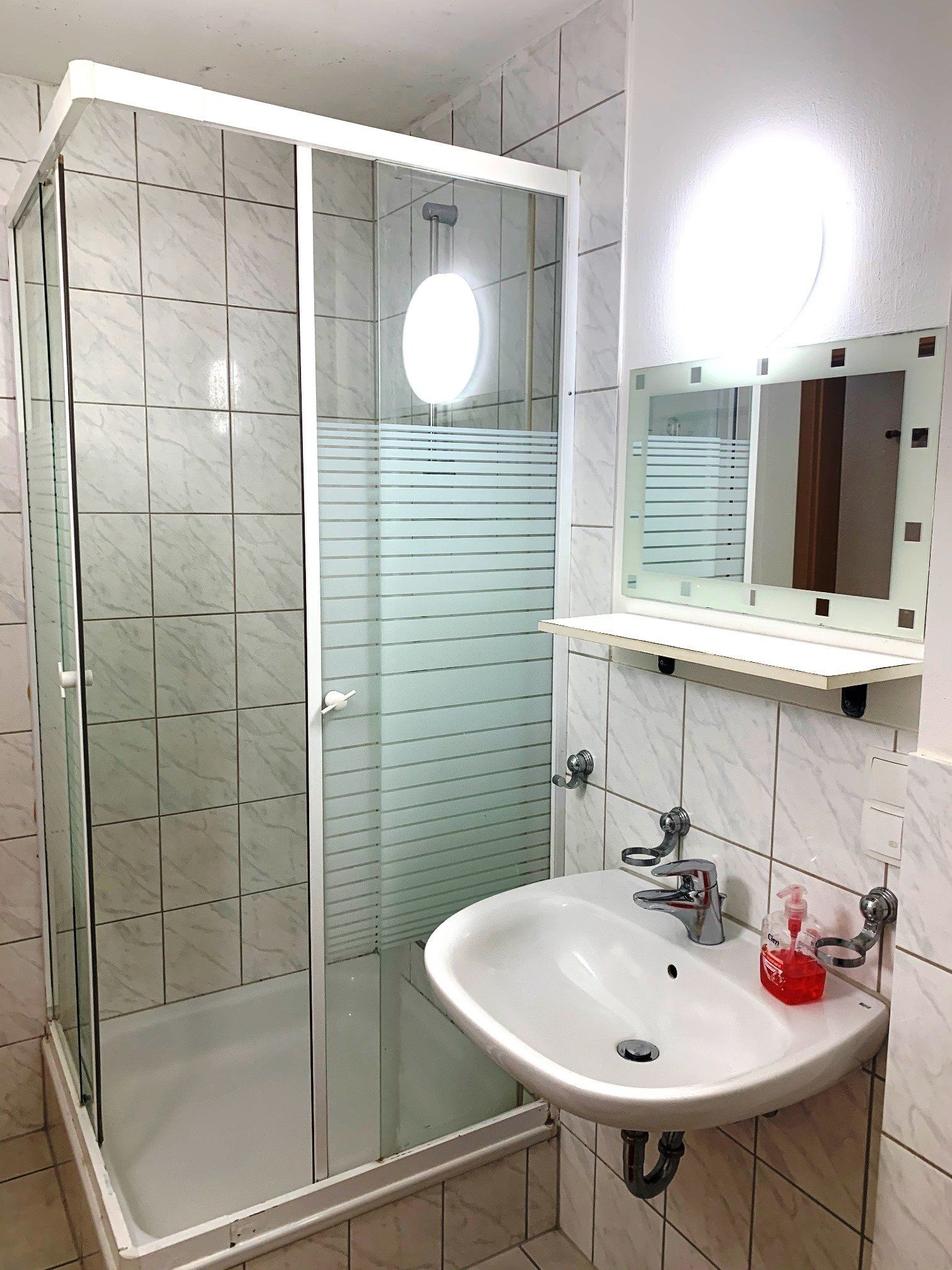 Bad mit Dusche, Waschbecken und WC im Zimmer/ in der Wohnung